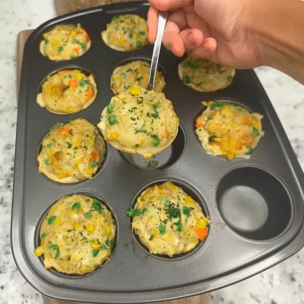 - Evenly distribute the chicken mixture into each biscuit-lined muffin cup.