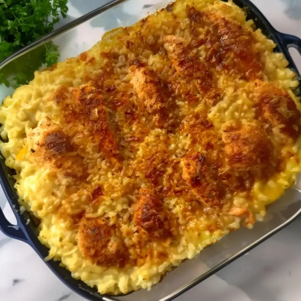 5. Sprinkle 🧅 dry onion soup mix evenly over the chicken and rice.