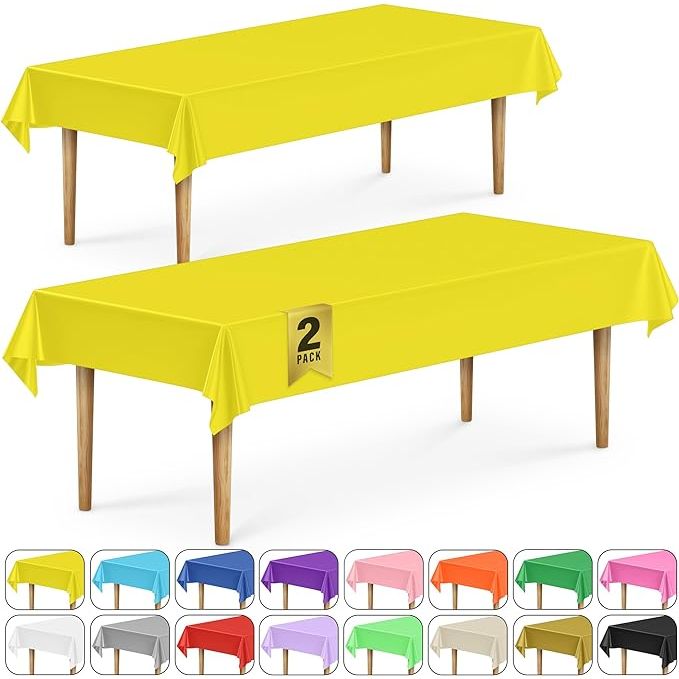 DecorRack 2 Rectangular Tablecloths are made from BPA-free plastic, measuring 54 x 108 inches. These tablecloths are designed to fit standard dining tables, providing a protective and decorative cover for parties, picnics, camping, and outdoor events. The vibrant yellow color adds a pop of color to any setting, making them perfect for both casual and formal occasions.