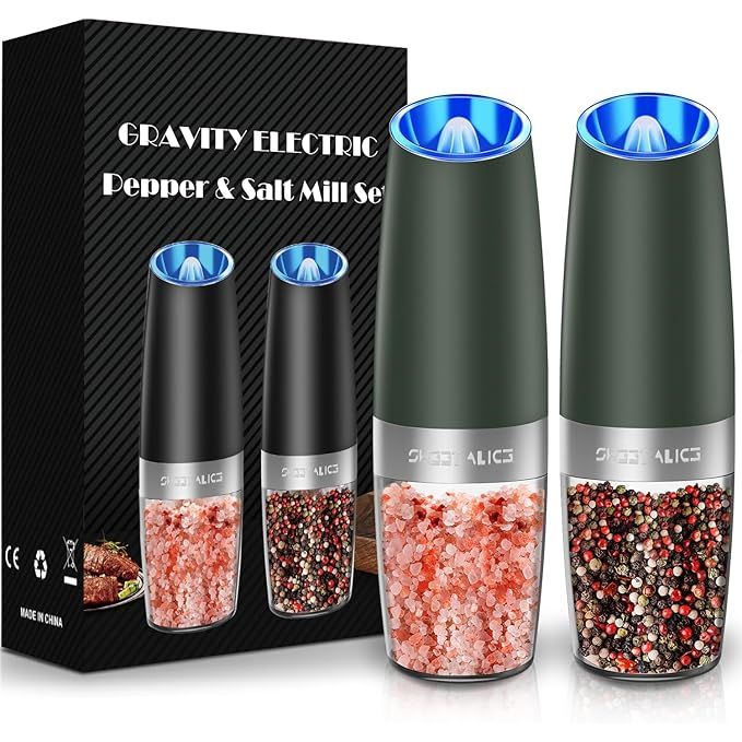 Sweet Alice Gravity Electric Pepper and Salt Grinder Set, Adjustable Coarseness, Battery Powered with LED Light, One Hand Automatic Operation, Dark Green, 2 Pack