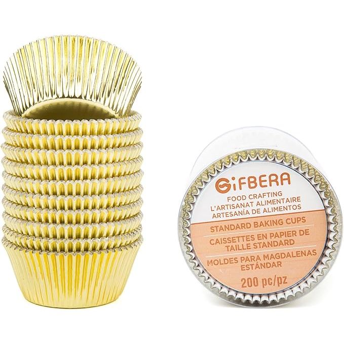 Gifbera Standard Gold Foil Cupcake Liners are metallic baking cups that come in a pack of 200. These cupcake liners are made with high-quality foil paper, which is safe for use in the oven and can withstand high heat without melting or deforming. The gold foil finish adds a touch of elegance to your baked goods, making them perfect for special occasions like weddings, birthdays, and other celebrations.